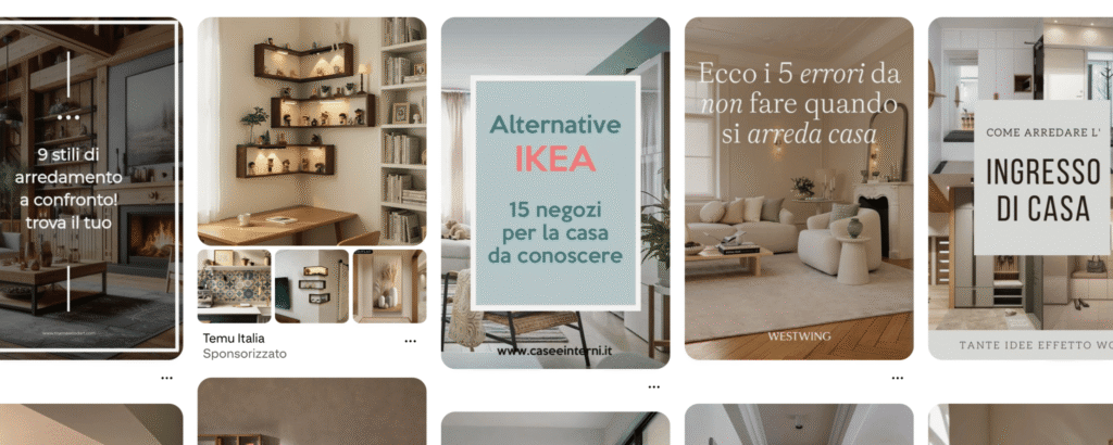 Su Pinterest vige la legge dell’immagine: per emergere serve pubblicare contenuti visivi di alta qualità. Investite in fotografia prodotto per e-commerce e in design grafico accattivante per i vostri Pin. Le immagini dovrebbero essere luminose, nitide, ben inquadrate e rappresentare al meglio i vostri mobili o complementi. Sì a foto ambientate (es. un divano fotografato in un bel salotto arredato) e a scatti che mostrano dettagli e materiali da vicino; no a immagini buie, sgranate o prive di contesto. Ricordate che molti utenti navigano Pinterest da mobile, dunque preferite immagini verticali (rapporto 2:3, ad esempio 1000 x 1500 px) che occupano più spazio nello schermo. Potete anche creare collage o Pin multi-immagine che mostrino un set coordinato di prodotti. L’importante è che ogni Pin catturi l’attenzione immediatamente nel feed affollato di Pinterest. Esempio: un Pin con la foto di una poltrona design inserita in un soggiorno elegante, con colori vivi e buona illuminazione, otterrà probabilmente più salvataggi di una foto scontornata su sfondo bianco. Inoltre, l’aspetto visuale dev’essere coerente con il vostro branding: utilizzate uno stile riconoscibile, in modo che chi vede più Pin dei vostri inizi a identificarne subito la provenienza.